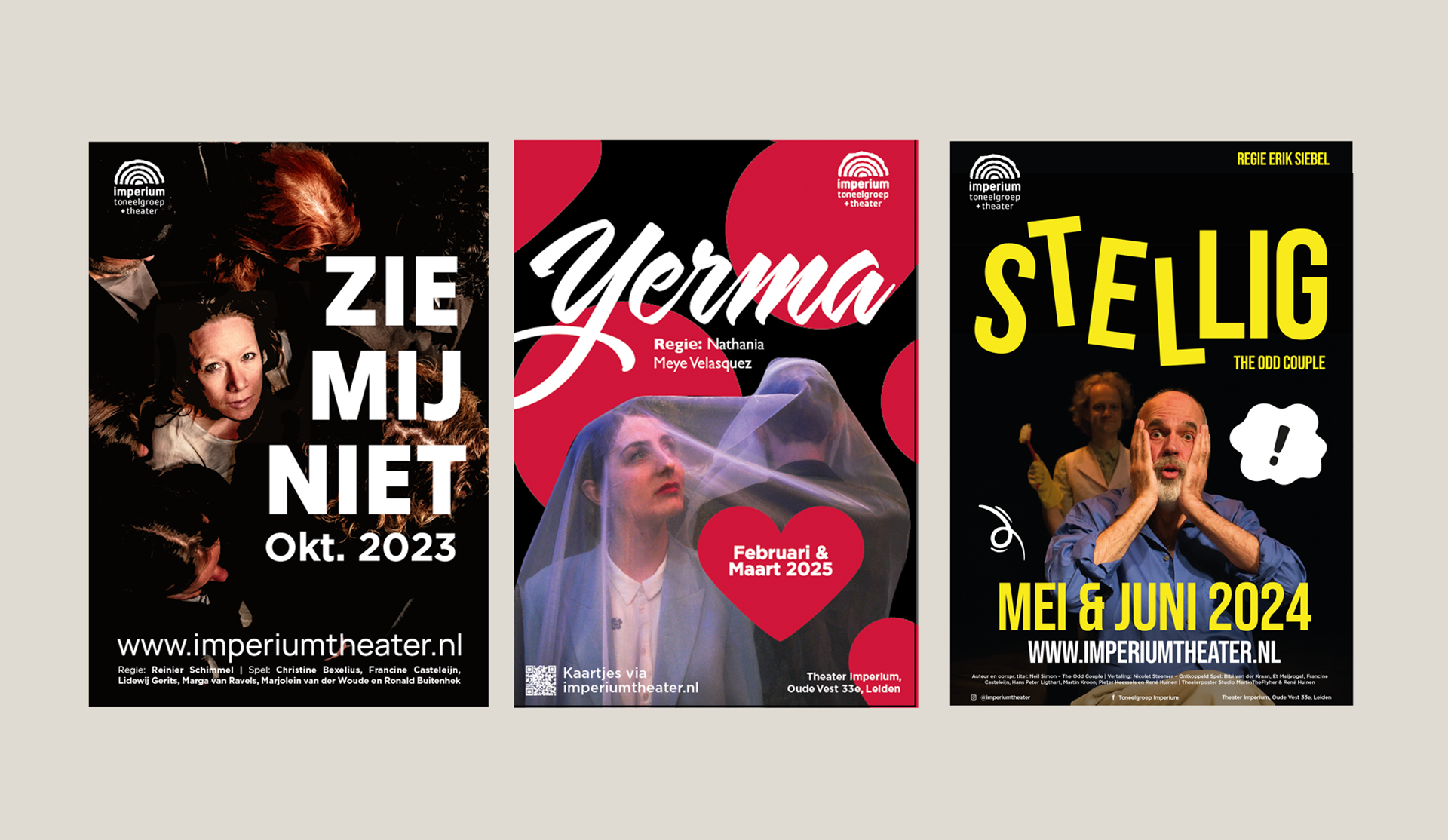 Campagnebeeld, Drukwerk, PromotieVoor theater imperium in Leiden ontwerpt de studio vier keer per jaar de uitingen van de shows die uitgevoerd worden door het theater gezelschap zelf.